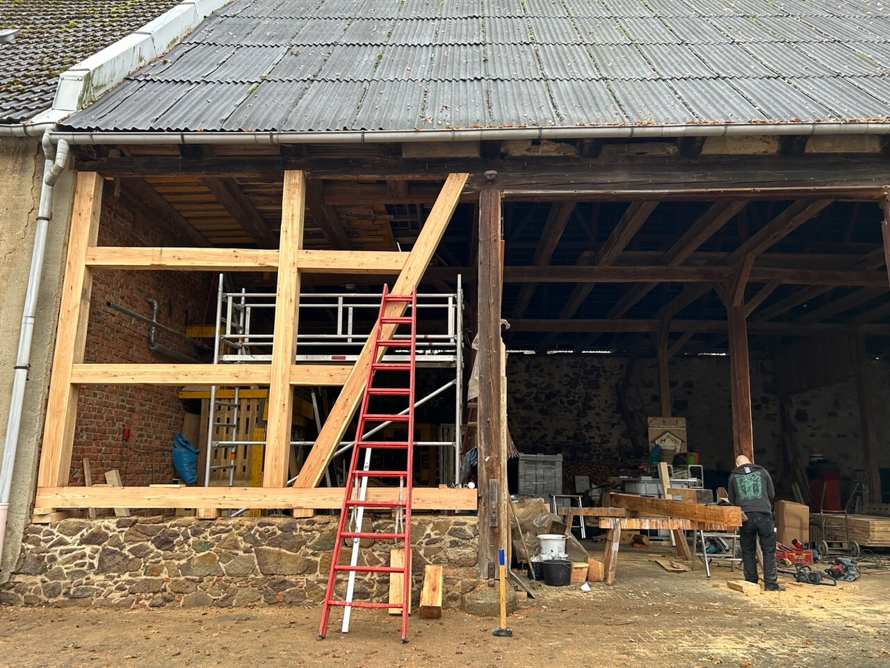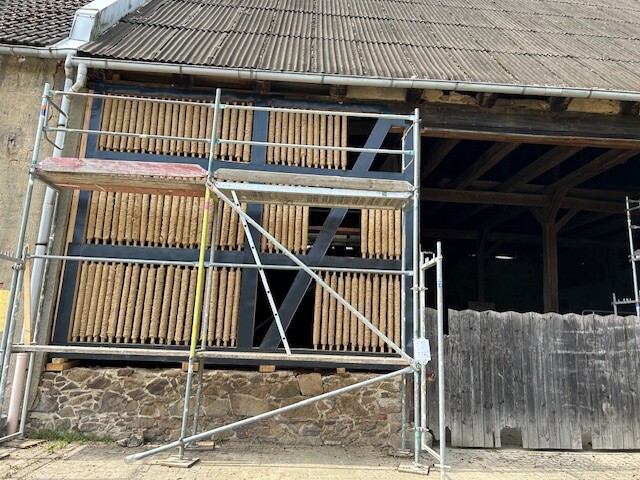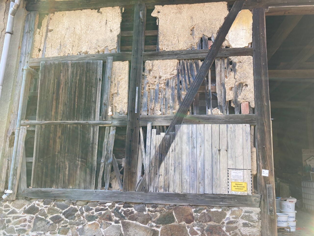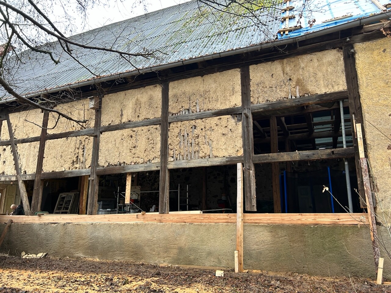 In der alten Scheune werden marode Holzbalken ausgetauscht und die kaputte Lehmwand abgetragen.