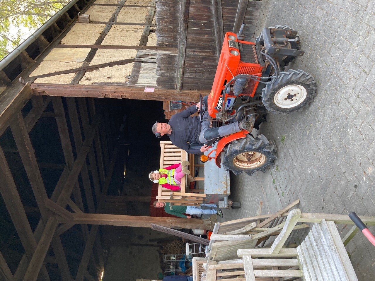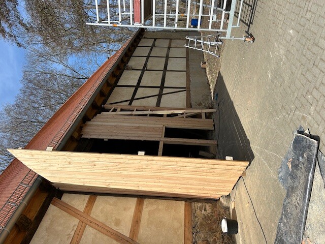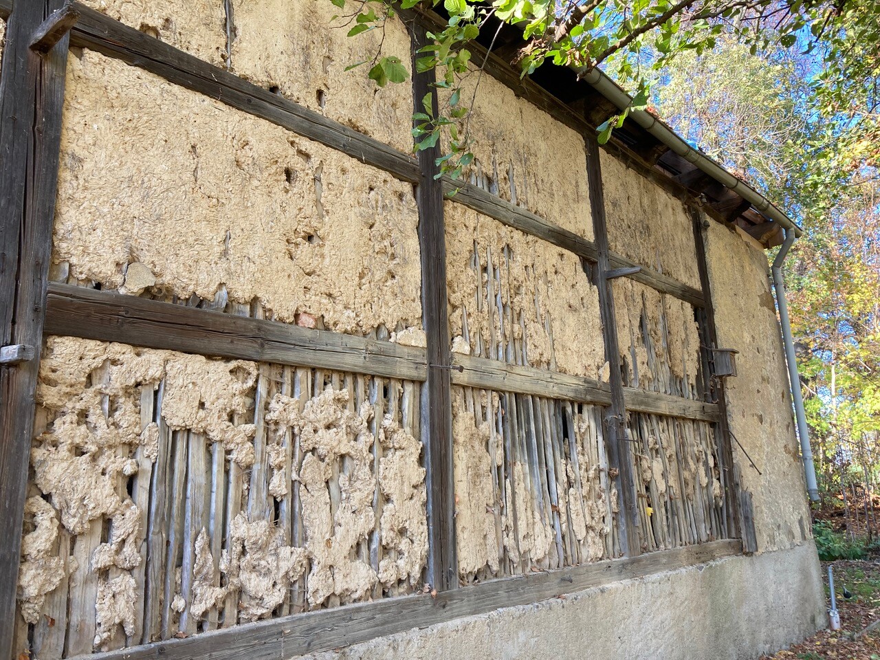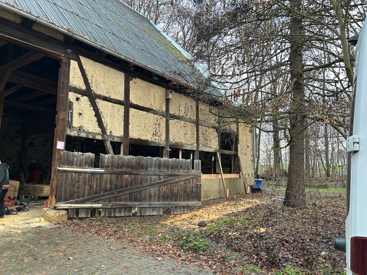 In der alten Scheune werden marode Holzbalken ausgetauscht und die kaputte Lehmwand abgetragen.