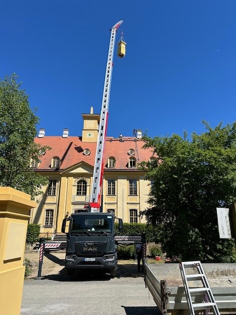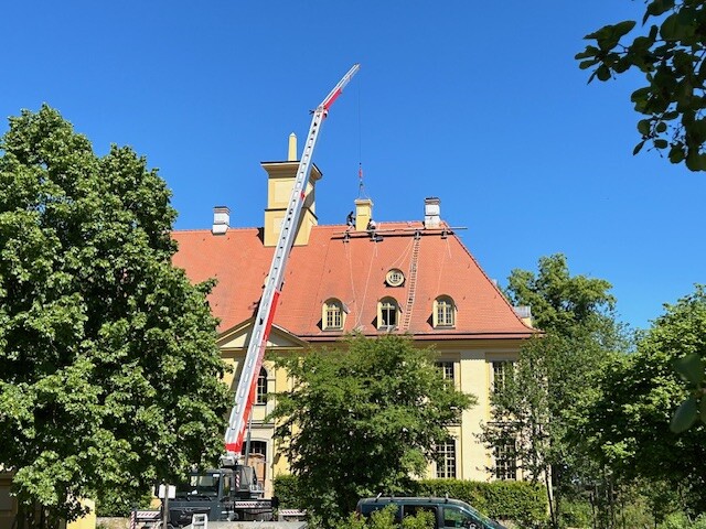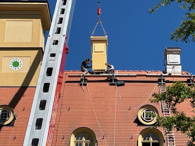 Austausch der vollkommen verrotteten Zierschornsteine auf dem Schloss im Mai